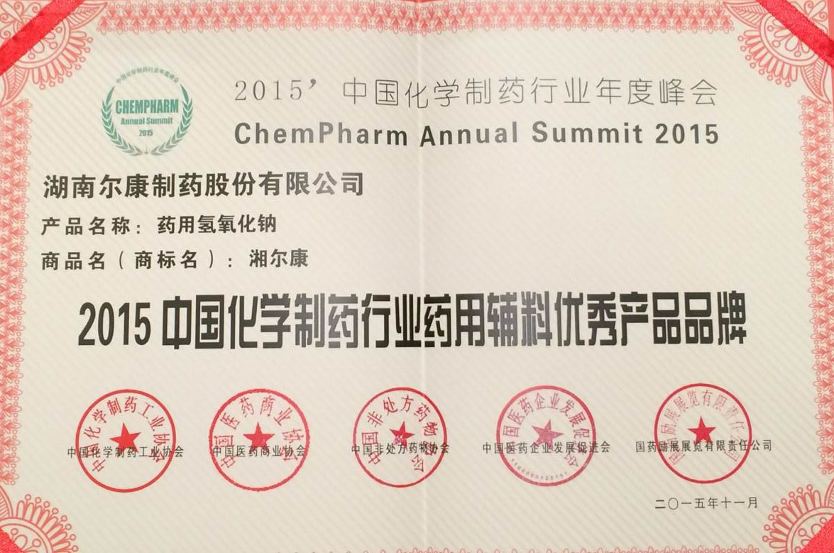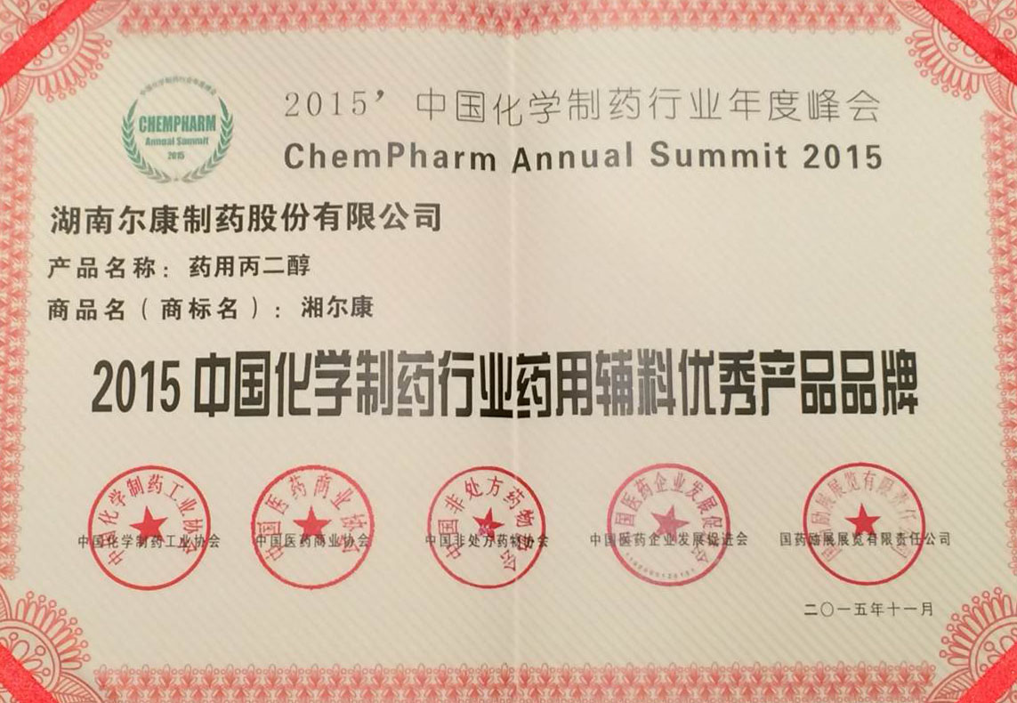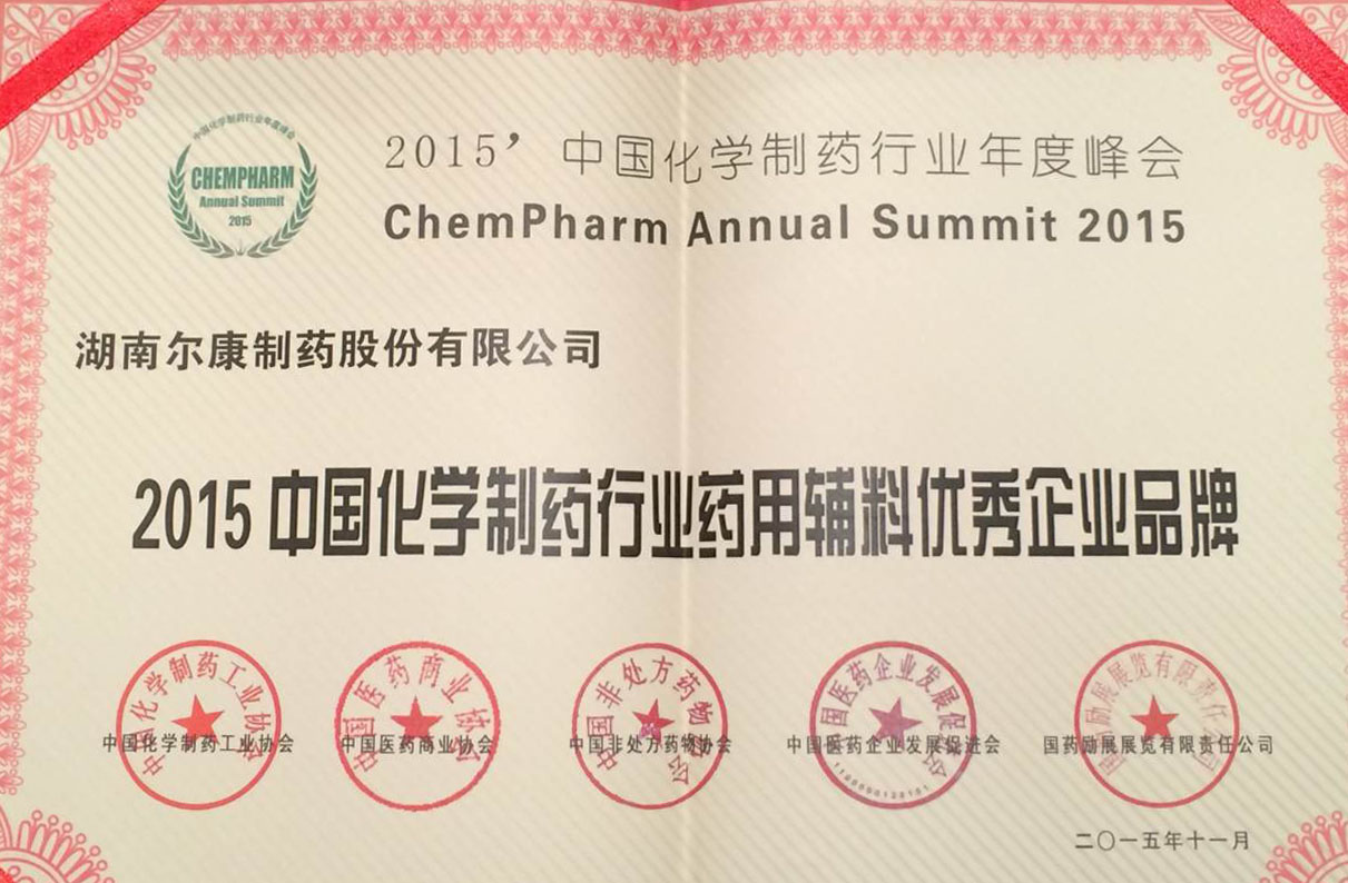 并獲評2015中國化學制藥行業成長型優秀企業品牌和2015中國化學制藥行業藥用輔料優秀企業品牌。
