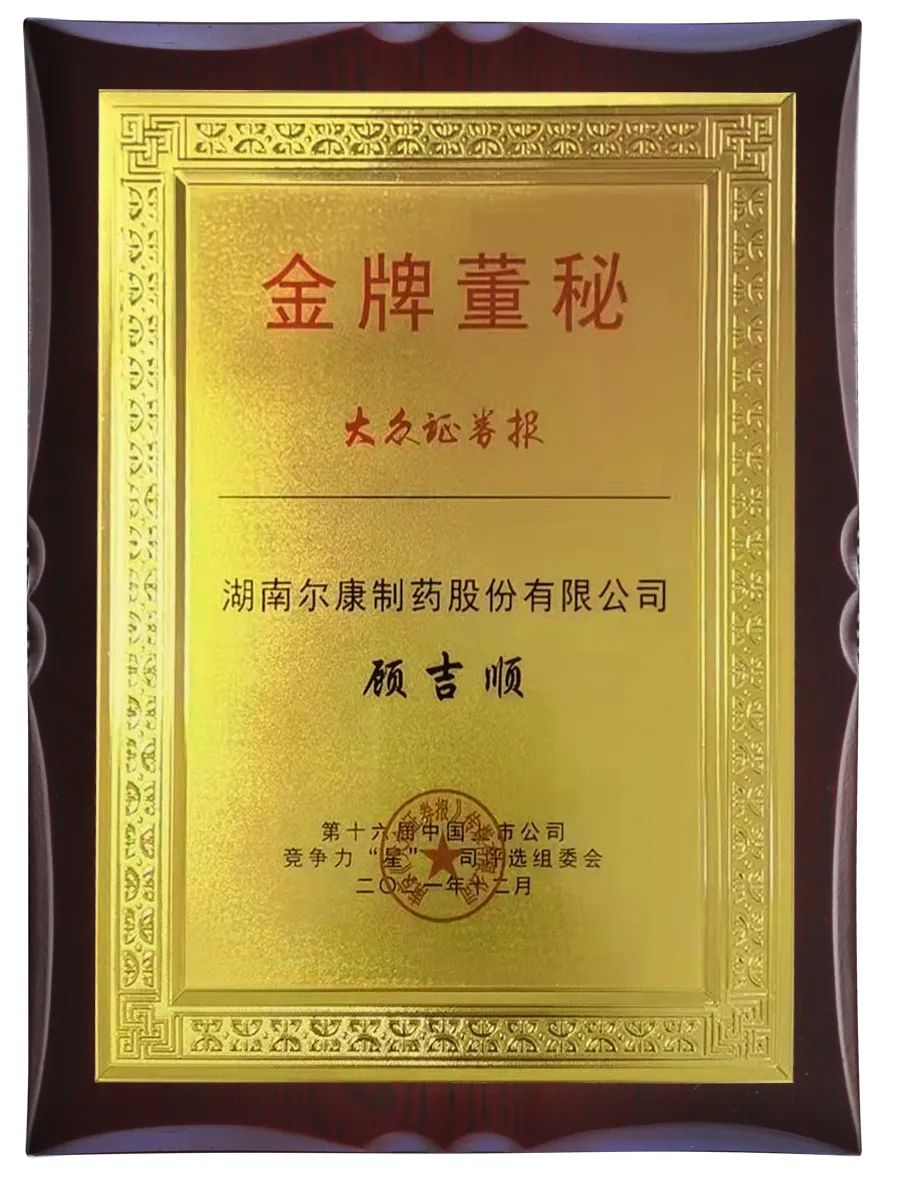 2021年12月26日,以“傳承百年信仰.新起點(diǎn)新征程”為主題的第十六屆“中國上市公司競爭力公信力‘星’公司”評選活動榜單揭曉,爾康制藥榮譽(yù)入選2021年度綠色發(fā)展“星”公司榜單,公司副總經(jīng)理、董事會秘書顧吉順當(dāng)選為金牌董秘。
